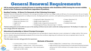 Earn 120 in-service points to include 20 hours in teaching students with disabilities (SWD) during the last validity period of the Professional Certificate (regardless of position).