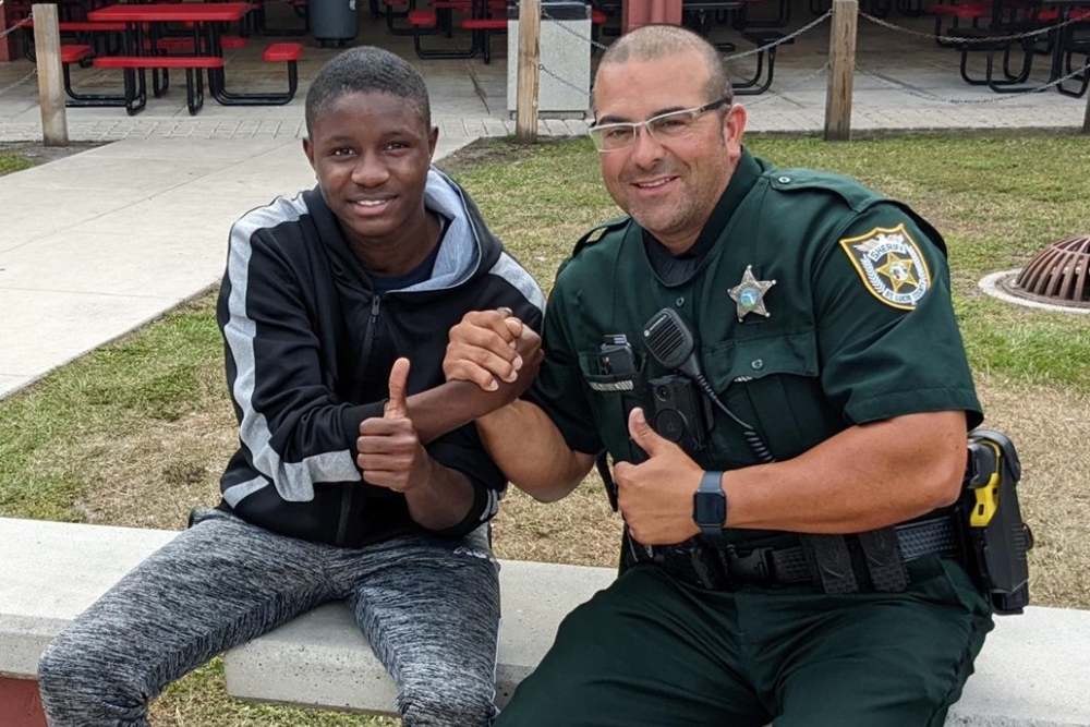 A smiling Black teenager and a uniformed sheriff's deputy give thumbs up while sitting together outside. The deputy wears a green uniform with a badge. They clasp hands in a gesture of camaraderie.