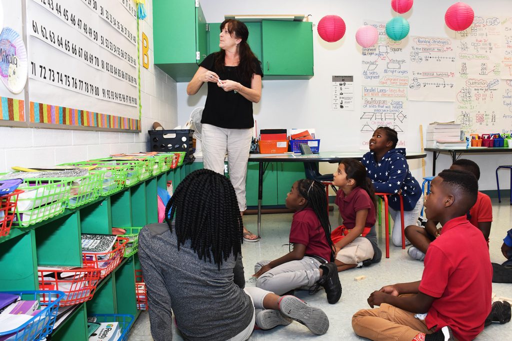 A teacher instructs a diverse group of elementary students on the floor in a colorful classroom. Math concepts are visible on the whiteboard, and learning materials are organized in colorful bins.